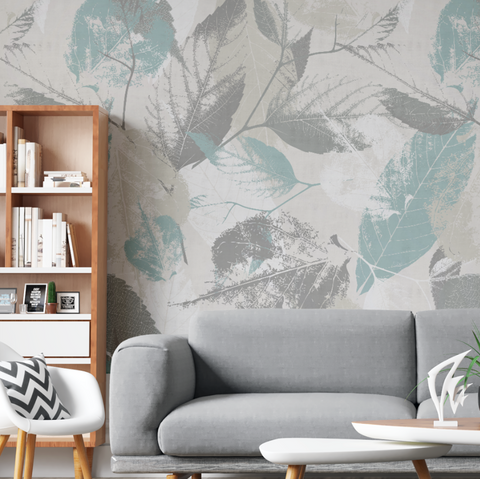 This stunning wallpaper design features a delicate arrangement of leaves in soft, muted tones of pale blue, gray, and beige, set against a textured, watercolor-like background. The gentle layering of foliage evokes the serene beauty of an autumn breeze, bringing a calming, nature-inspired charm to any space. Perfect for minimalist or modern interiors, an ideal choice for adding a touch of seasonal elegance to bedrooms, living rooms, or tranquil retreats.